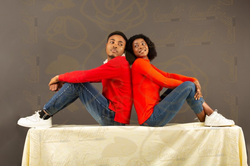 Un couple d'adulte afro debout côte à côte, avec un style décontracté,