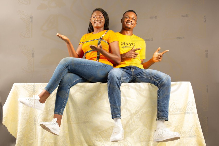 Un jeune couple africain , assis cote à cote souriant, fun, style décontracté