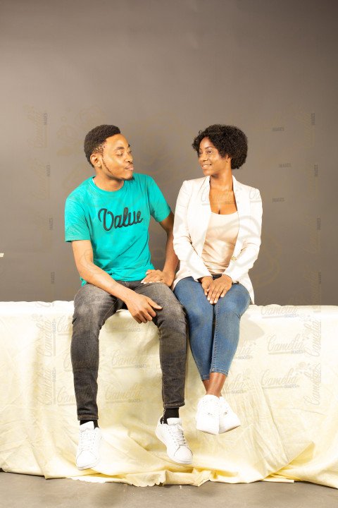 Une jeune femme africaine , assise prêt d'un jeune homme africain , elle repoussant ce dernier avec un air fâché , style décontracté