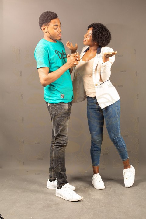 Un jeune couple africain , assis l'un prêt l'un de l'autre avec une attitude mécontent, style décontracté