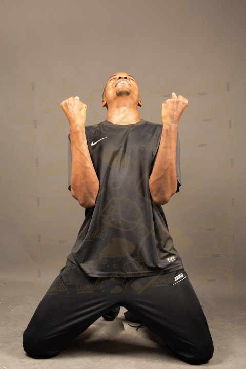 Un jeune-homme africain en noir , à genoux, jubilant intensément , style décontracté et sportif