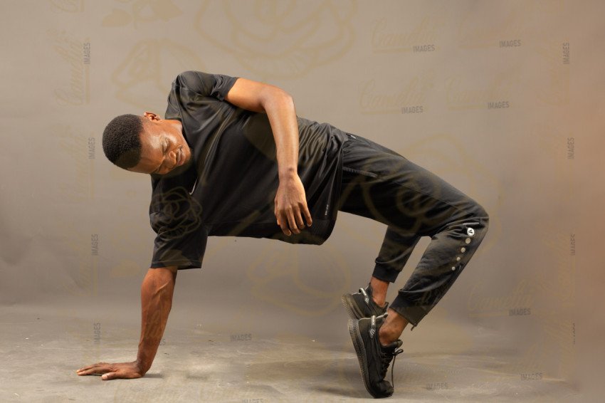 Un jeune-homme africain en noir , faisant des acrobaties , style décontracté et sportif