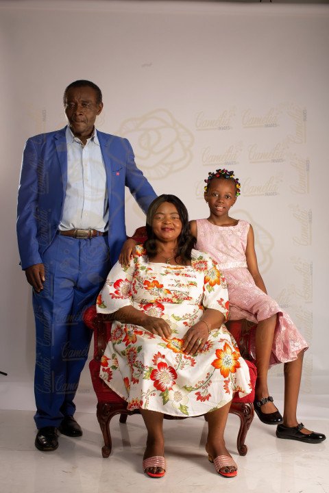 Des grands-parents africain et leur petite-fille , tous souriants, fixants l'objectif
