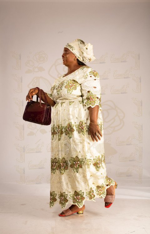 Une femme africaine sexagénaire, vêtu d'une robe blanche avec des motifs de fleurs , avec des mules