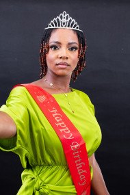 Une jeune femme Afro, souriante, en ténue verte ,avec une écharpe de joyeux anniversaire rouge et des écritures dorées, et un diadème sur sa tête