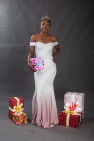 Belle jeune femme afro , courbée ,vêtue d'une longue robe élégante avec un diadème sur la tête ,des coffrets à cadeau de noël au à ses côtés .
