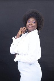 Une jeune femme noire , regardant l'objectif, vêtue d'une chemise blanche et d'une jupe grise claire, sur fond noir.