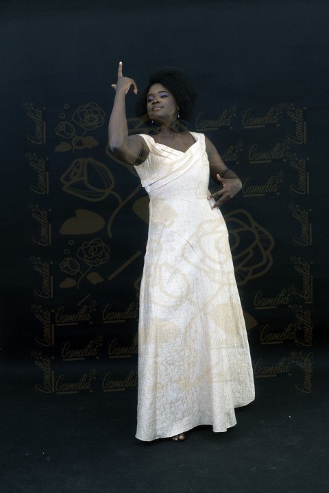 Une femme noire souriante, de profil, vêtue d'une chemise blanche et d'une jupe grise claire, sur fond noir.