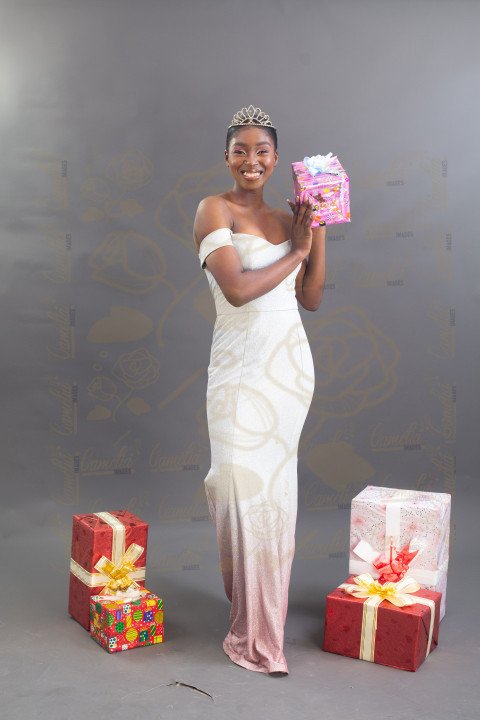 Jeune femme noire élégante, souriante,joyeuse, avec une robe de soirée glamour,avec un diadème, avec des joliments emballés à ses côtés.