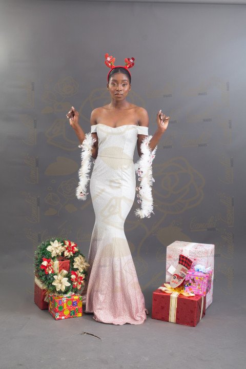 Jeune femme noire élégante ,joyeuse,avec une robe de soirée glamour,une couronne de noël,des cadeaux et décorations de Noël à ses côtés.
