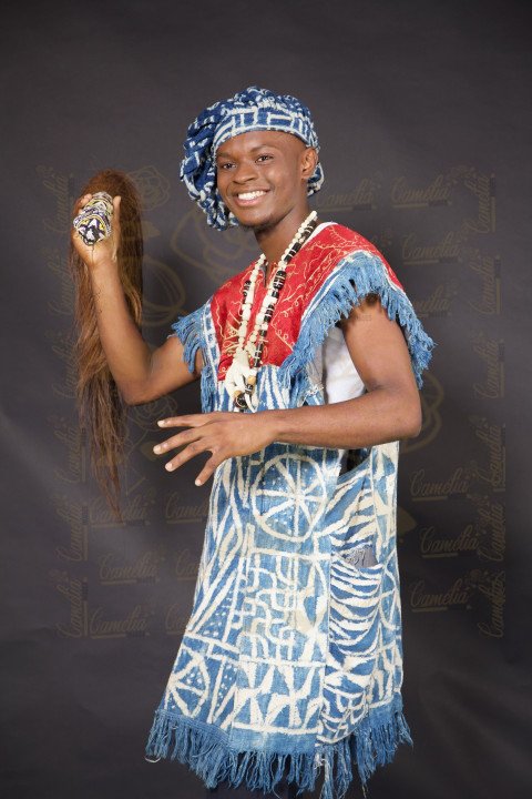 Jeune Africain souriant tenue collier queue cheval traditionnelle