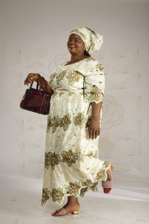 Jeune femme africaine,souriante, assise, vêtue d'une robe orange, avec un turban noir, des boucles d'oreilles pendantes, et un maquillage artistique.