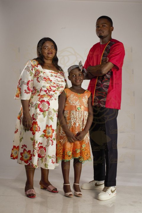 Belle jeune femme noire ,vêtue d'une longue robe élégante ,souriante, à moitié couchée .
