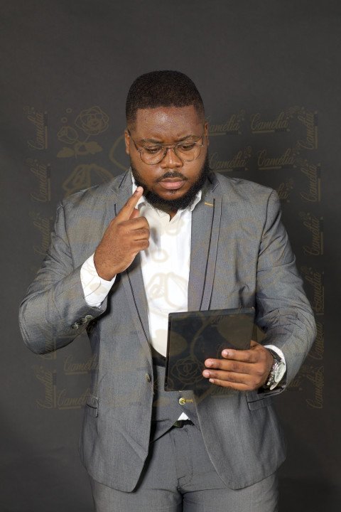 Hommes Africain salutation joie costumes gris violet cravate paire noire