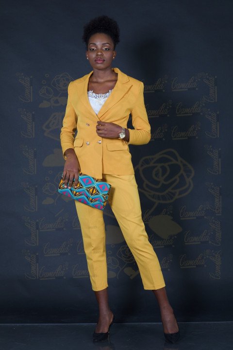 Femme Affaire jeune talon noir costume jaune sac main afritude