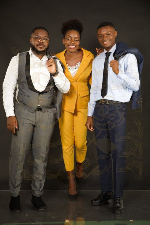 Femmes Africaines teint chocolat veste noire bleu et jaune negociation business