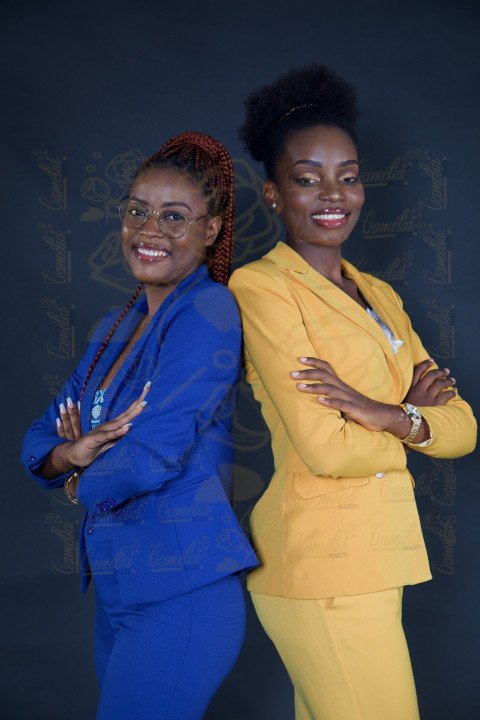 Deux femmes africaines ensemble veste jaune et bleu de dos jolie sourire talon