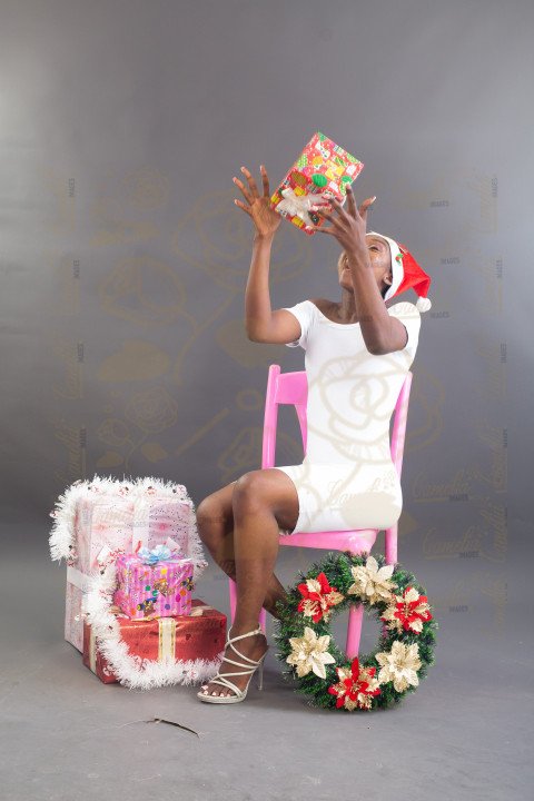 Jeune femme noire élégante ,assise,joyeuse,avec une courte robe blanche,un chapeau de noël,tenant un cadeau,décorations de Noël à ses côtés.