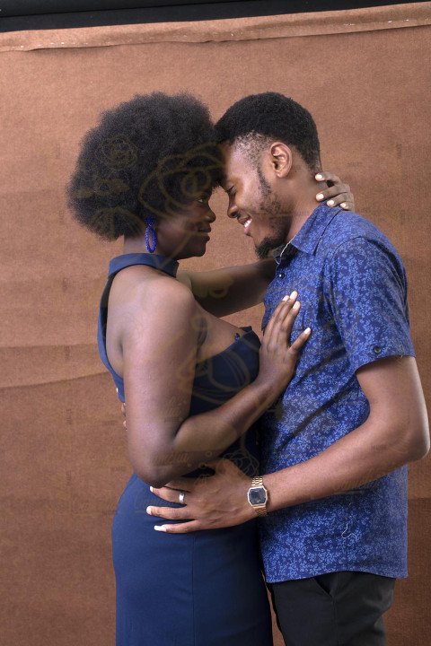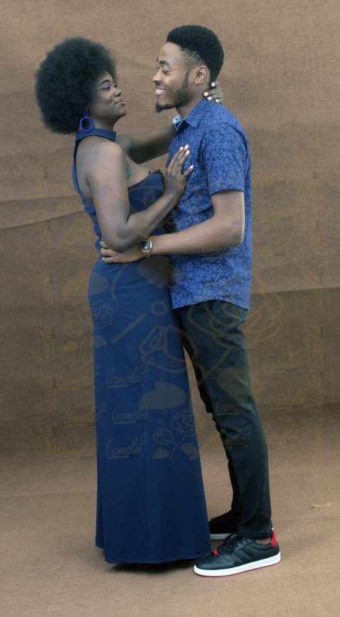 Un jeune couple afro souriant, avec une pose affectueuse et affirmant leur relation amoureuse.