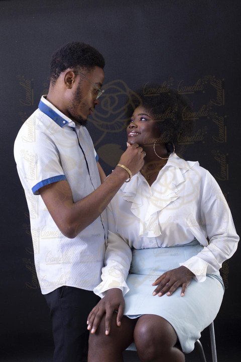 Un jeune couple africain , assis l'un prêt l'un de l'autre avec un léger sourire, style décontracté