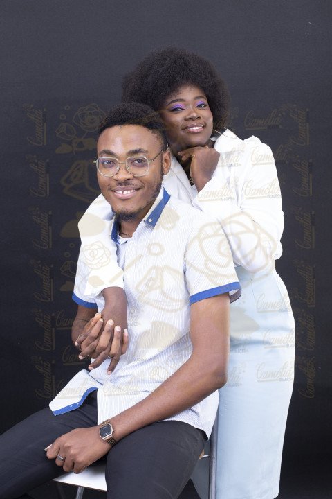 Un jeune couple africain assis cote à cote, les pieds croisés et repliés vers soi même, style simple et décontracté